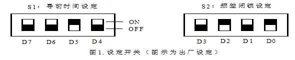 - 頻差閉鎖設(shè)定開關(guān):此組亦為四位二進制設(shè)定開關(guān),頻差閉鎖范圍與其關(guān)系見表二;此組設(shè)定主要是為