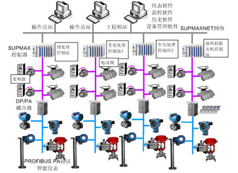 Profibus PA總線主要連接符合Profibus PA協(xié)議的智能壓力變送器、溫度變送器和液位變送器,以及分析儀器等。Profibus DP總線主要連接各種符合Profibus DP協(xié)議的變頻器、智能馬達(dá)控制器、電動執(zhí)行機(jī)構(gòu)等。各種設(shè)備包括格柵、鼓風(fēng)機(jī)、污水泵、回流污泥泵、剩余污泥泵、脫水機(jī)、攪拌器、刮泥機(jī)、電動閥門、閘門、電動堰門、輸送機(jī)及各種水位儀表及水質(zhì)分析儀器等通過Profibus現(xiàn)場總線進(jìn)行數(shù)據(jù)采集和控制,并做到關(guān)鍵設(shè)備的連鎖,實現(xiàn)整個污水處理過程的自動化。
