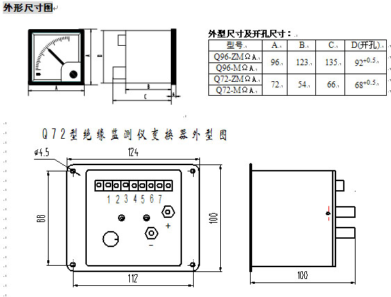 主要參數(shù)和技術(shù)指標(biāo) ● 儀表指示偏轉(zhuǎn)角:Q96-MΩA、Q72-MΩA,90°Q96-ZMΩA、Q72-ZMΩA, 240° ● 使用環(huán)境溫度范圍:-25℃~+55℃ ● 耐振動(dòng):頻率1~100Hz,加速度≤10m/s2 ● 絕緣強(qiáng)度:線路對(duì)外殼2000Vac,1min ● 外磁場(chǎng)強(qiáng)度:≤400A/m ● 儀表準(zhǔn)確度等級(jí):⑩級(jí)(基準(zhǔn)值為指示值,按GB/T7676-1998中相關(guān)要求) ● 工作電源容差:100Vac(或220Vac)±15% ● 儀表消耗功率:不大于5VA ● 輸出觸點(diǎn)容量:阻性,28V,5A;220V,1A ● 報(bào)警設(shè)置及容差:10kΩ±2kΩ;30kΩ±3kΩ 60kΩ±3kΩ;100kΩ±5kΩ ● 儀表重量:Q96-ZMΩA、Q72-ZMΩA, 1.1kg Q96-MΩA、Q72-MΩA, 0.9kg |
