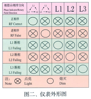 2. 當(dāng)接通電源后,各相所對應(yīng)的指示燈點亮;如有缺相時對應(yīng)此相的指示燈會熄滅,且正序與逆序指示燈同時點亮。